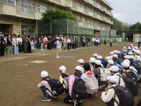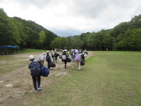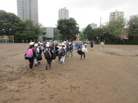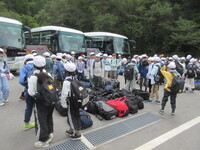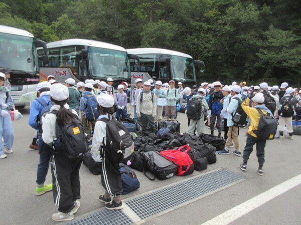 ・まずは、1日目、浦和別所小学校の校庭に朝の6:30に集合しました。朝早い時間でしたが、子どもたちは、大きな荷物を抱えて、歩いて登校してきました。