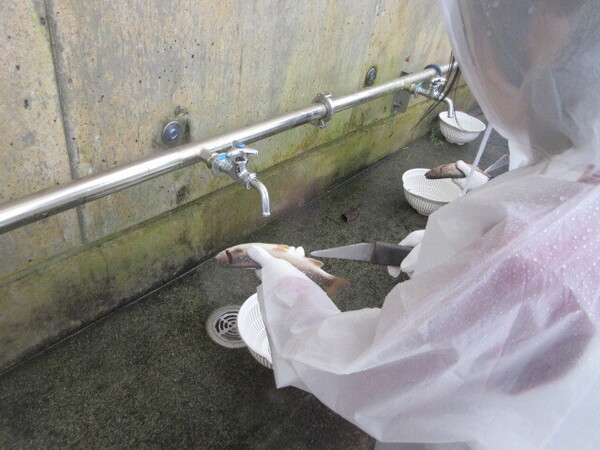 ・最初に、所員の田中さんから川魚さばきの次の手順を教えていただきました。
