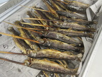 ・「ぎゃあ、魚が動く!」と騒ぎながら作業する子もいれば、平然と落ち着いて魚をもち、目を手で覆い、魚を落ち着かせて、作業している子もいて、いろいろでしたが、仲間同士で協力し合って、なんとか串を刺し、塩を付けるところまで行うことができていました。