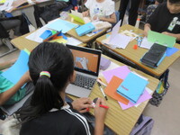 ・子どもたちは、前回までに簡単なデザインを作成していましたが、そのデザインをもとに仕組みを作成しながら、招待状を仕上げていきました。