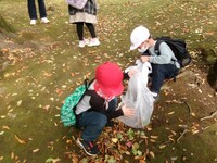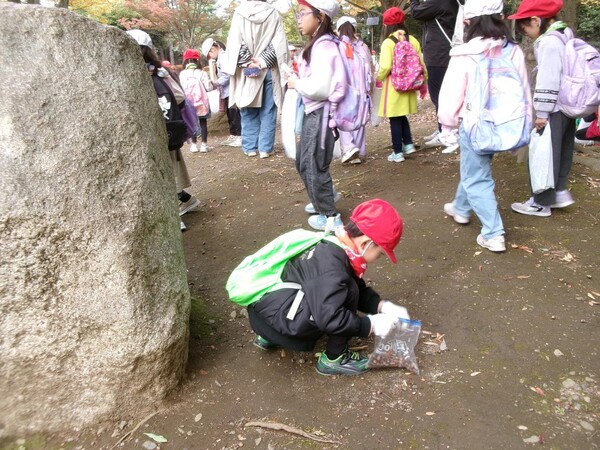 ・別所沼公園に着くと、秋見つけということで、2年生の子どもたちが、ペアの1年生の手を引き、一緒になってドングリや落ち葉などを拾いました。