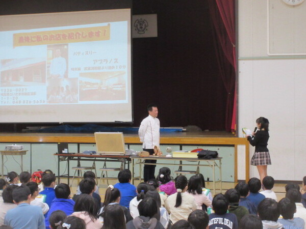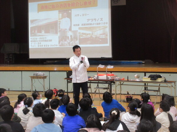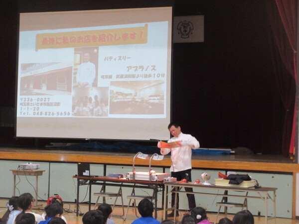・先週の金曜日に、さいたま市教育委員会の主催する、夢工房 未来(みら)くる先生 ふれ愛推進事業の一環で、武蔵浦和駅近くの「パティスリー アプラノス」の朝田晋平さんが来校し、5年生の子どもたちに話をしてくれました。