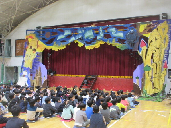 ・私は、1回目の公演を1年生、6年生の子どもたちと参観させてもらいましたが、役者さんの演技は、もちろん、舞台装置や照明の効果等による臨場感が満載で、1時間の公演があっという間に感じるほど、楽しませてもらいました。