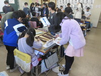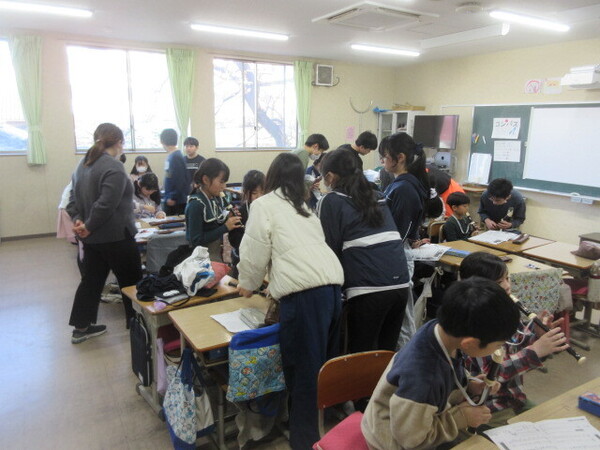 ・具体的には、それぞれの教室に行き、6年生が3年生の子どもたちにリコーダーやコンパスの使い方等を教えています。