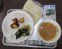 ・献立は、味噌ラーメン、だいがくいも、わかめのナムル、牛乳です。