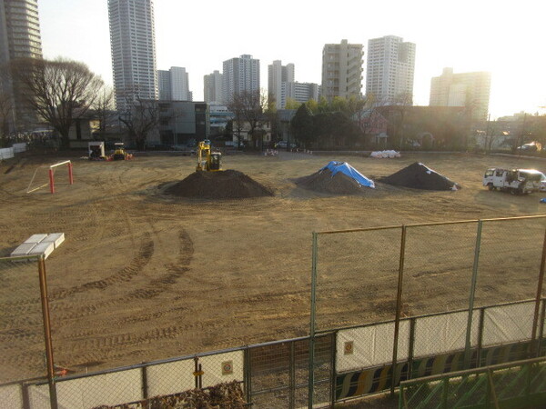 ・校庭の真ん中には、大きく盛り土がされていて、今後、これらの土や砂が、少しずつ入れられていくようです。