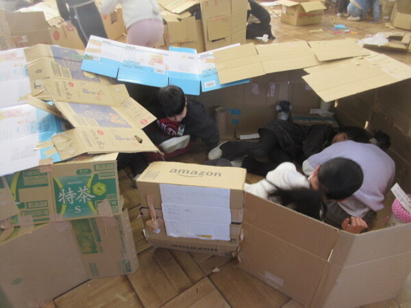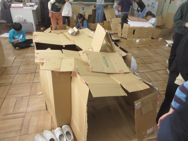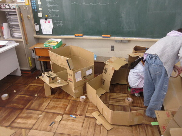 ・その後、実際に使っている場面を見ていなかったので、ダンボールのことは、すっかり忘れていましたが、昨日と本日、4年生の教室の前を通った際に子どもたちが楽しそうにダンボールを使って作品を作っている様子を見かけました。