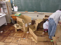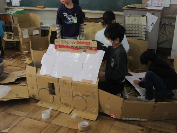 ・教室の机といすを廊下に出して、教室をめいいっぱい広くして、グループごとに作品づくりをしていましたが、子どもたちの様子を見ると、作品というよりは、秘密基地をつくっているような感じがしました。