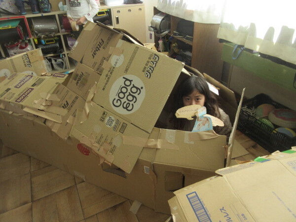 ・「ここに見張り用の窓をつくったの」「インターフォンもつけてみた」「隣の部屋とくっつけられるんだよ」など、子どもたちは、いろいろ教えてくれましたが、その発想の豊かさにびっくりしました。