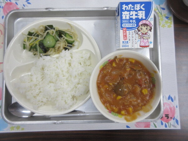 ・ミートボールシチュー、もやしとわかめのサラダ、ごはん、牛乳というメニューでしたが、とくにミートボールシチューは、給食のメニューとは初となり、大変良い味付で美味しかったです。