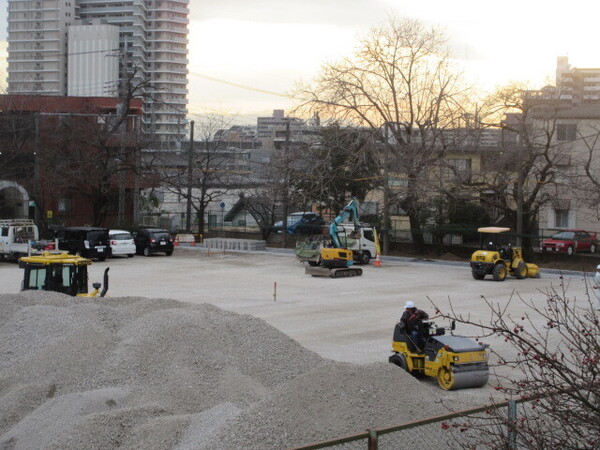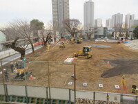 ・校庭には、たくさんの重機が入って、作業を進めていますが、本日は、山になっていた土や砂利を平らにならして、圧縮して固めていました。