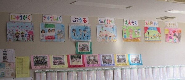 ・1年生の教室の背面には、1年間の主な行事の絵が飾られています。