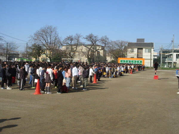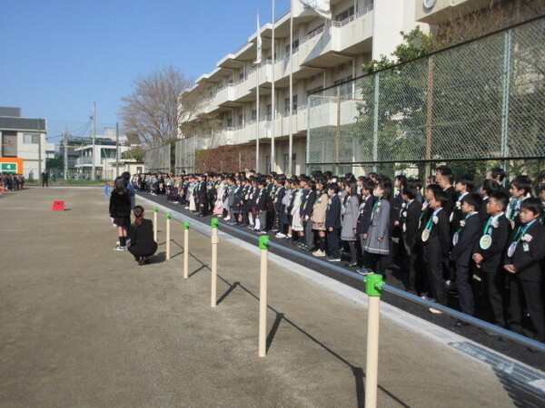 ・本日より、使用開始となった校庭に全校児童が集まり、6年生への感謝とお別れのメッセージを送りました。
