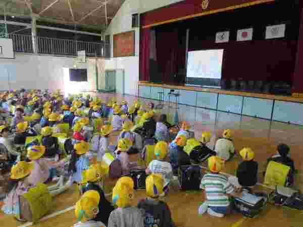 1年生の子どもたちは体育館に移動して、動画を視聴しながら懇談会が終わるのを待ちます。
